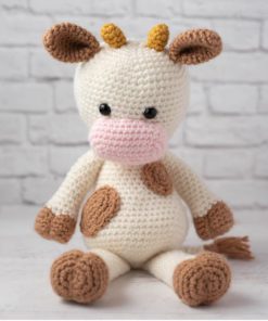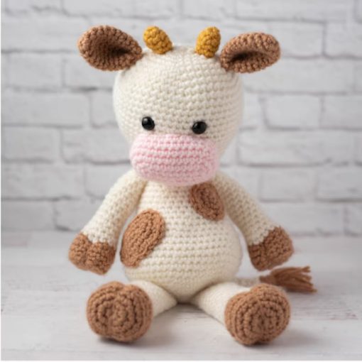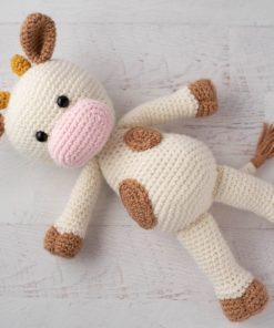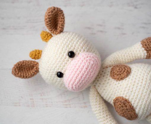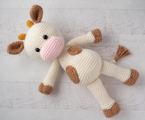 Yarn weight and gauge does not need to be exact, just adjust hook size for your chosen yarn. Cow shown is approximately 13.5″ tall from top of head to bottom of feet.